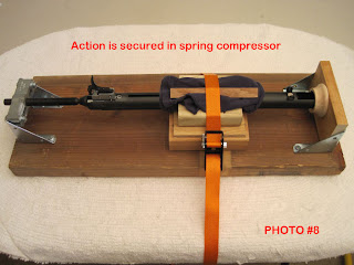 Next, secure the action in the spring compressor (PHOTO 8), centering the compressor shoe with the rear of the trigger assembly.